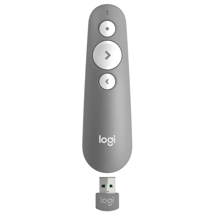 De couleur gris, la télécommande de présentation Logitech R500s allie performance et esthétisme. Son design épuré et moderne ajoutera une touche d'élégance à votre équipement de bureau.